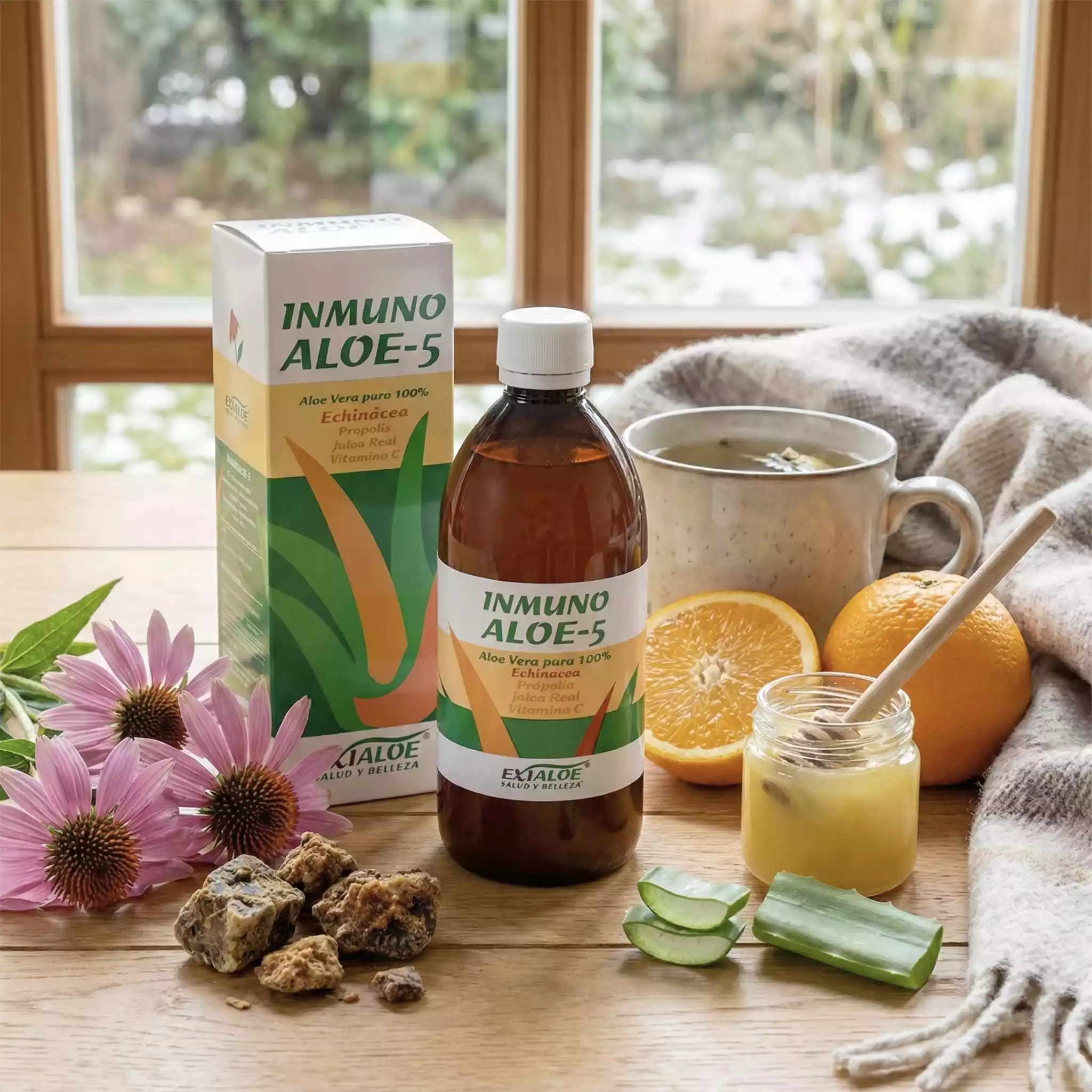 Existe un producto que llevo recomendando un tiempo y que reúne precisamente estos “Vengadores” de la inmunidad en una sola fórmula: el INMUNO ALOE-5 de Exialoe.